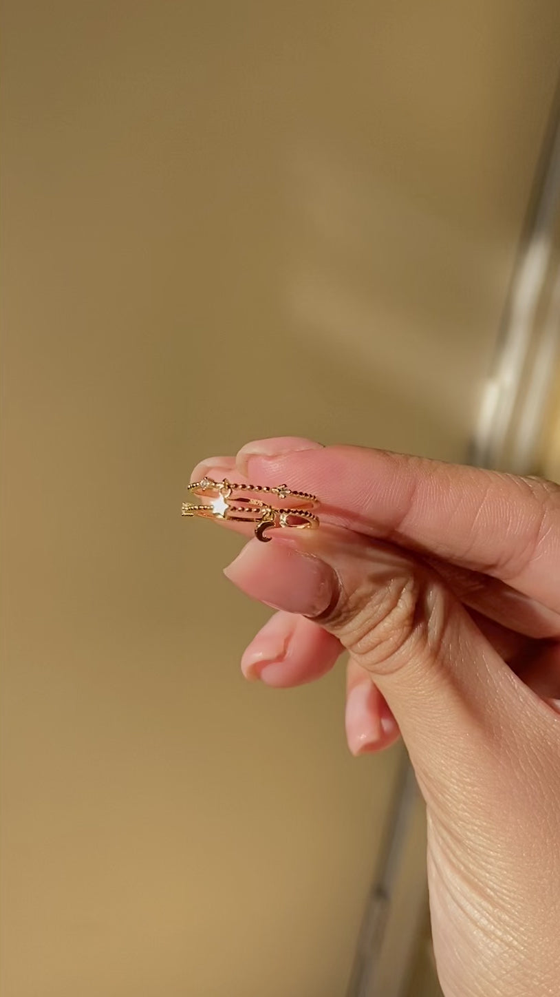 Add a touch of celestial charm to your jewelry collection with the Lua Charm Ring. This beautifully crafted piece features delicate star and moon charms, complemented by a unique two-layer bead effect. Made from 100% real 925 sterling silver and luxuriously plated in 18K gold, this ring is both elegant and versatile, perfect for any occasion.